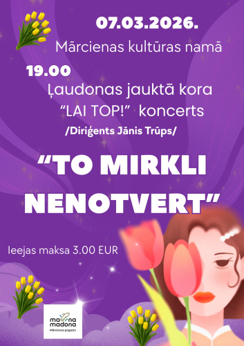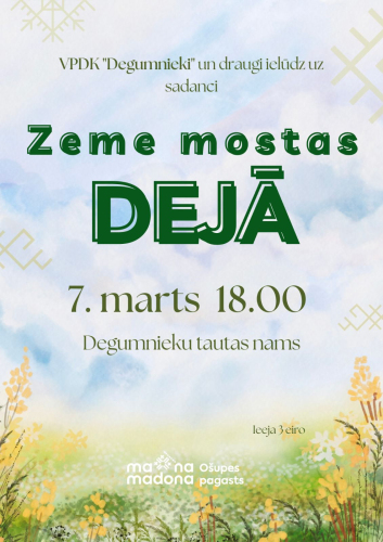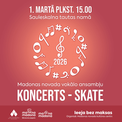 17. janvāris 14:00 - 31. marts 17:00Annas Simtnieces izstāde “Būt ar sevi”2. februāris 10:00 - 31. marts 17:00Izstāde "Manas zemē iesētās dienas" 3. februāris 10:00 - 30. aprīlis 17:00“Barkava manās atmiņās” 5. februāris 09:00 - 31. marts 17:00Izstāde "Labo domu valdziņi" Sauleskalnā20. marts 19:00 - 22. marts 18:00Dziesminieku festivāls “Austrasdienas 2026” Madonas novadā21. marts 17:00 - 22. marts 01:00"Kori sadzied Ērgļos -2026"22. marts 14:00 - 16:00Viesizrāde “Tāda es esmu” Sauleskalnā22. marts 16:00 - 17:30Viesizrāde "Klusumā" Cesvainē