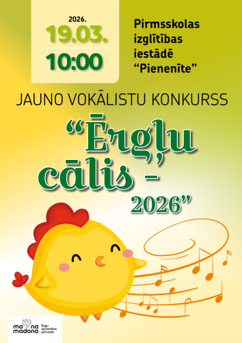 19. marts 10:00 - 11:00 19. martā plkst. 10.00 pirmsskolas izglītības iestādē “Pienenīte” norisināsies jauno vokālistu konkurss “Ērgļu cālis -2026”.
