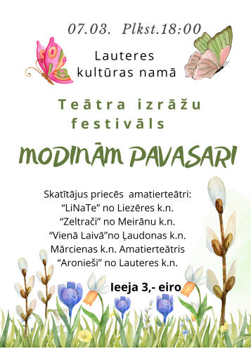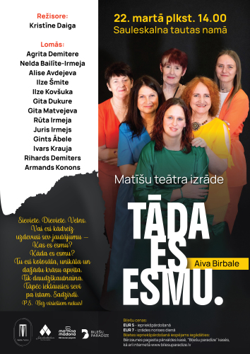 14. marts 14:00 - 15:30 14. martā plkst. 14.00 Degumnieku tautas namā Cesvaines tautas teātris ar prieku un lielu aizrautību ielūdz ikvienu skatītāju uz dziesmu spēli “Draudzes bazārs” – Ādolfa Alunāna luga Ilzes Kraukles režijā.
