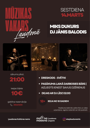 17. janvāris 14:00 - 31. marts 17:00Annas Simtnieces izstāde “Būt ar sevi”20. janvāris 09:00 - 20. marts 17:00Līgas Klusas gleznu izstāde “Dabas pieskāriens krāsās " Kraukļos2. februāris 10:00 - 31. marts 17:00Izstāde "Manas zemē iesētās dienas" 3. februāris 10:00 - 30. aprīlis 17:00“Barkava manās atmiņās” 5. februāris 09:00 - 31. marts 17:00Izstāde "Labo domu valdziņi" Sauleskalnā16. februāris 10:00 - 16. marts 18:00Guntas Sanderes fotogrāfiju izstāde “Klusuma horizonti”14. marts 21:00 - 15. marts 02:00Mūzikas vakars - Miks Dukurs un DJ Jānis Balodis Ļaudonā15. marts 13:00 - 14:45Kinoseanss ''Goat:Labākais pasaulē''15. marts 15:00 - 16:39Kinoseanss ''Marsupilami:Jokainais zvēriņš''