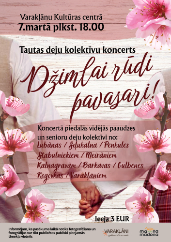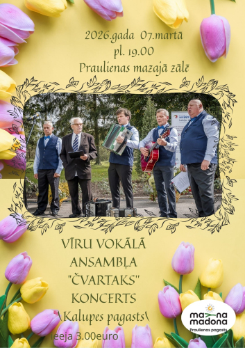 17. janvāris 14:00 - 31. marts 17:00Annas Simtnieces izstāde “Būt ar sevi”2. februāris 10:00 - 31. marts 17:00Izstāde "Manas zemē iesētās dienas" 3. februāris 10:00 - 30. aprīlis 17:00“Barkava manās atmiņās” 5. februāris 09:00 - 31. marts 17:00Izstāde "Labo domu valdziņi" Sauleskalnā28. marts 17:00 - 18:30Koncerts "4 kurpes"28. marts 18:00 - 20:00TDA “Lubāna”- 40 koncerts “Tur, kur satiekas prieks!”