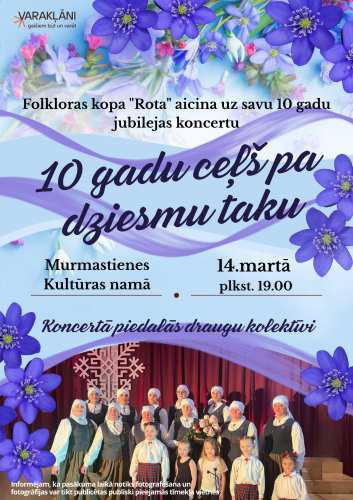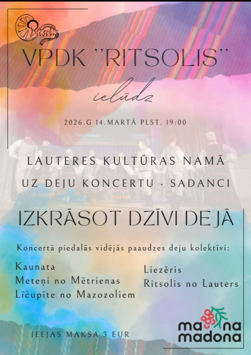 28. marts 17:00 - 18:30 Šī gada 28. martā Eksotisko deju studija “Ugunspuķe” aicina savus skatītājus uz daudzveidīgu, spilgtu koncertu “4 kurpes”, kurā uzstāsies dažādu pilsētu un dažādu deju stilu kolektīvi.