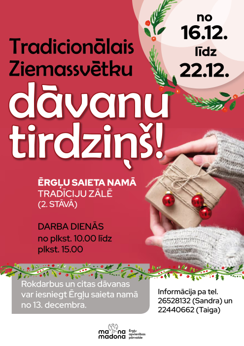 16.-22. decembrim Ziemassvētku dāvanu tirdziņš Ērgļos