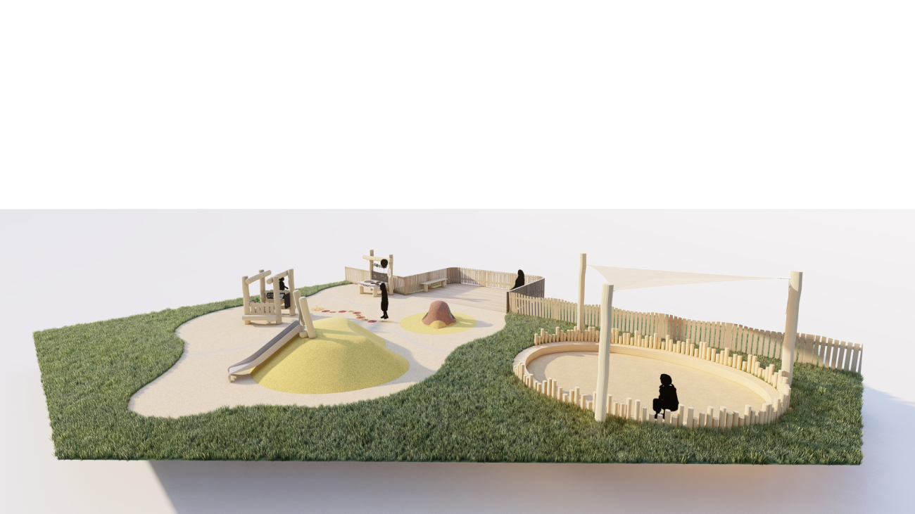 - rotaļu zona dažādām vecumu grupām (1-3 gadi; 3-4 gadi; 5-7 gadi vai apvienotās rotaļu zonas) ar atbilstošu drošības segumu zem rotaļu elementiem - lietais gumijas segums vai lietais gumijas mulčas segums, vai smilts segums;