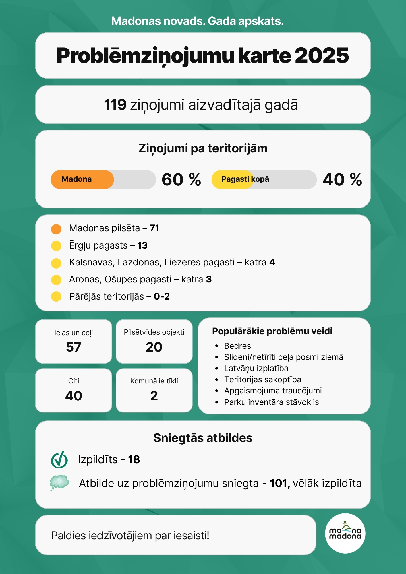 Zīmīgi, ka 2025. gadā ziņojumi saņemti arī no tādām vietām kā Dzelzava un Mētriena, kur iepriekš iedzīvotāji bijuši mazāk aktīvi. Tomēr atsevišķās vietās, piemēram, Barkavas, Ļaudonas, Murmastienes, Sarkaņu un Vestienas pagastos, aizvadītajā gadā nav reģistrēts neviens ziņojums, kas var liecināt gan par apmierinātību ar esošo situāciju, gan nepieciešamību vēl vairāk popularizēt šo rīku iedzīvotāju vidū.