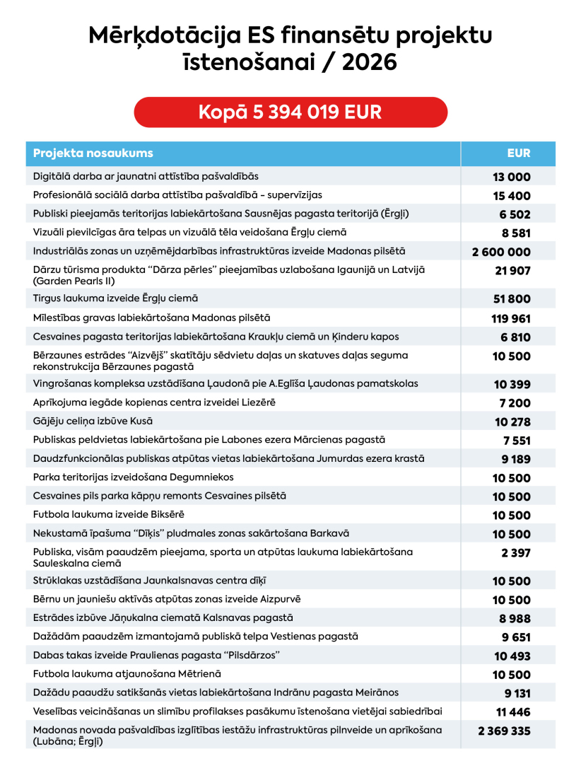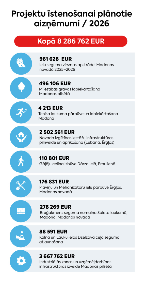 Starp vērienīgākajiem darbiem, kas šogad jāpabeidz vai jāturpina, ir: industriālās zonas un uzņēmējdarbības infrastruktūras izveide Madonā (kopumā vairāk nekā 6 miljoni eiro); Lubānas un Ērgļu skolu modernizācija un infrastruktūras pilnveide (vairāk nekā 4,8 miljoni eiro); jauna pansionāta būvniecība Cesvainē; Mīlestības gravas labiekārtošana Madonā; Saieta laukuma bruģa nomaiņa Madonā un Madonas apvedceļa virskārtas atjaunošana; ielu dubultās virsmas apstrāde pagastos; vairāki LEADER projekti visā novada teritorijā.