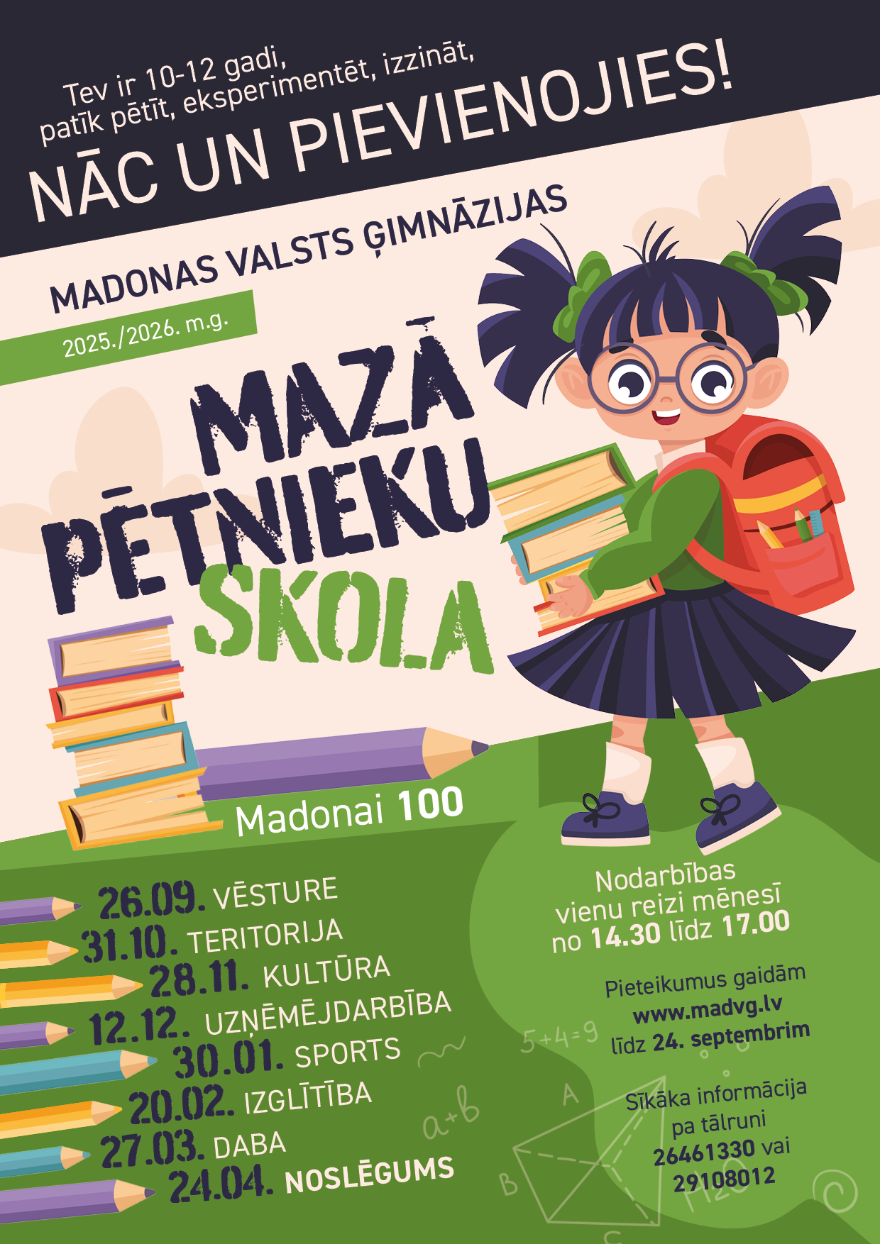 Madonas Valsts ģimnāzija aicina skolēnus vecumā no 10 līdz 12 gadiem izzināt, eksperimentēt, pētīt MAZAJĀ PĒTNIEKU SKOLĀ, kura atsāks savu darbu 26.septembrī.