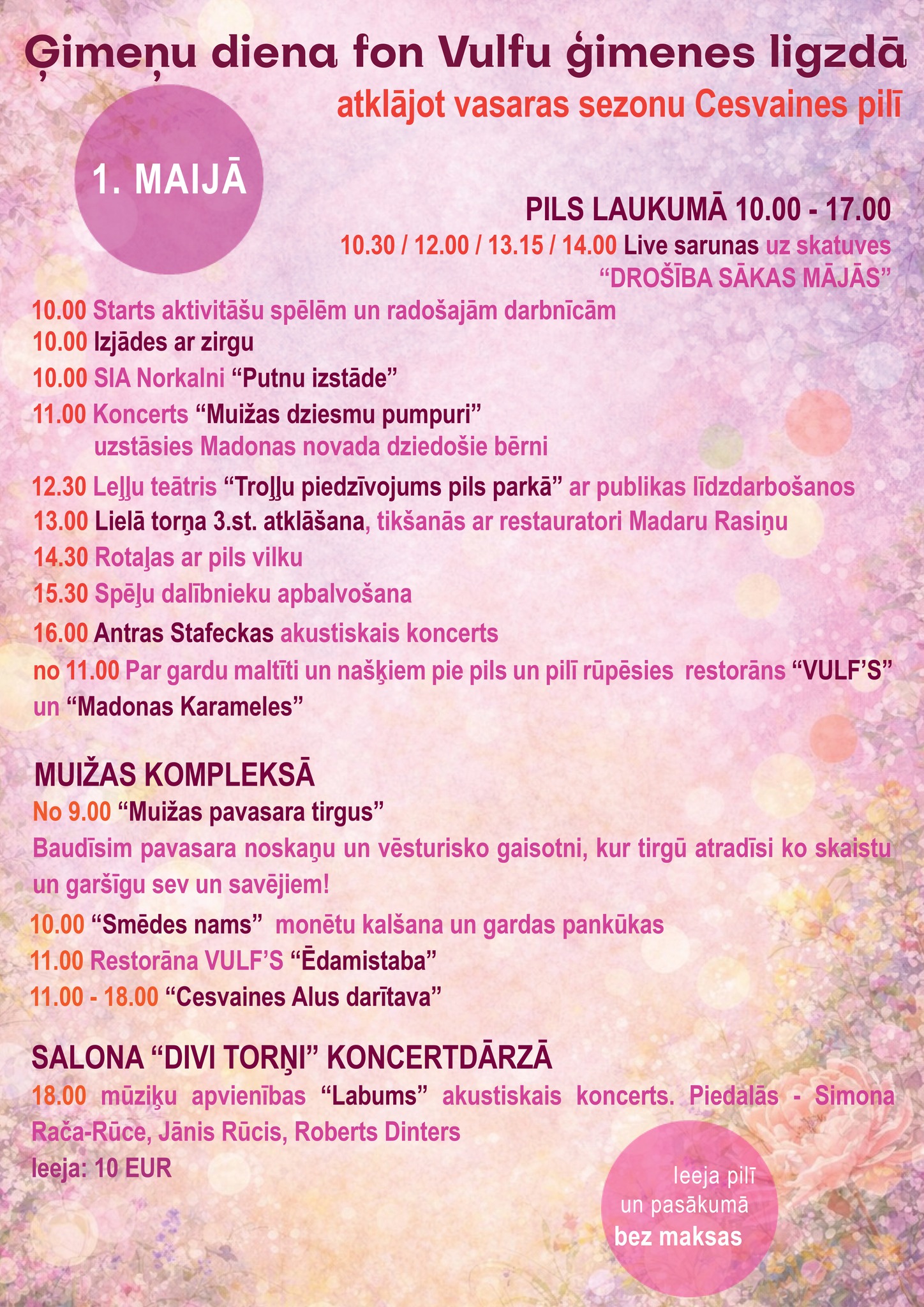 No plkst. 10.00 līdz 18.00 norisināsies Ģimeņu diena “Fon Vulfu ģimenes ligzdā”, kas jau tradicionāli iezīmē jaunās tūrisma sezonas sākumu Cesvaines pilī. Dienas garumā būs iespēja baudīt daudzveidīgu programmu – radošās darbnīcas, aktivitātes bērniem, koncertus un iedvesmojošas sarunas par ģimenes vērtībām, radot īstu svētku sajūtu visai dienai.