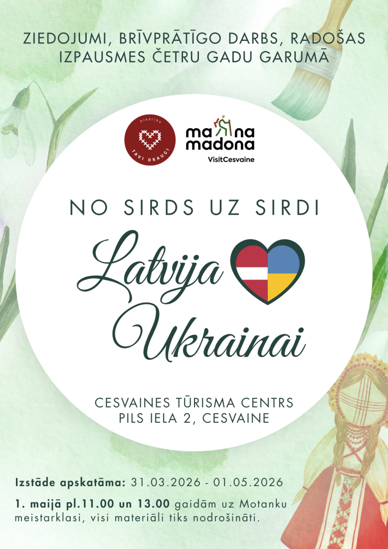 Būs arī izstādes "No sirds uz sirdi - Latvija Ukrainai" noslēguma pasākums un plkst. 11.00 un 13.00 ukraiņu aizsardzības lellīšu Motanku meistardarbnīcas muižas staļļos esošajā tūrisma centrā.