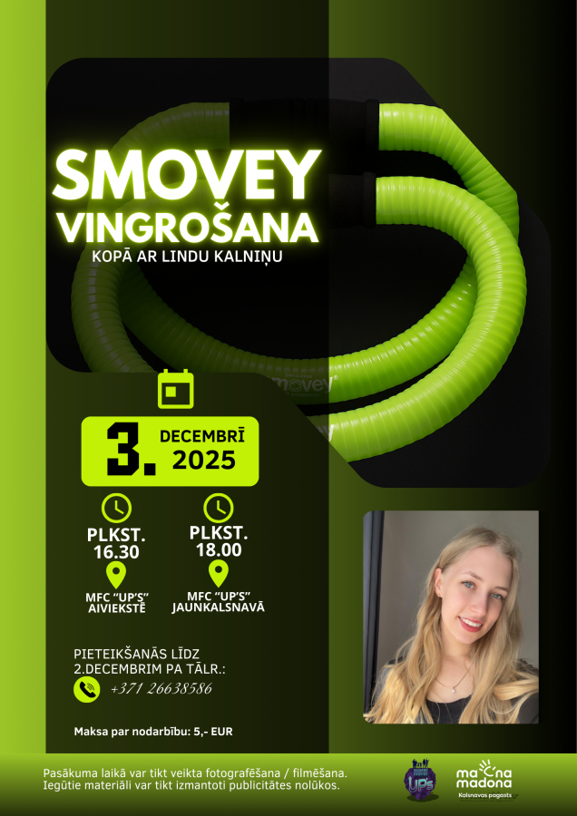 Smovey – tas ir kustību prieks, ritms un labsajūta, kas piemērots cilvēkiem ar dažādu fizisko sagatavotību. Nāc un izmēģini, jo tas uzlabo līdzsvaru, spēku un kopējo pašsajūtu! Tev vajadzīga tikai vēlme kustēties – par labu noskaņojumu un iedvesmu parūpēsies trenere Linda Kalniņa!