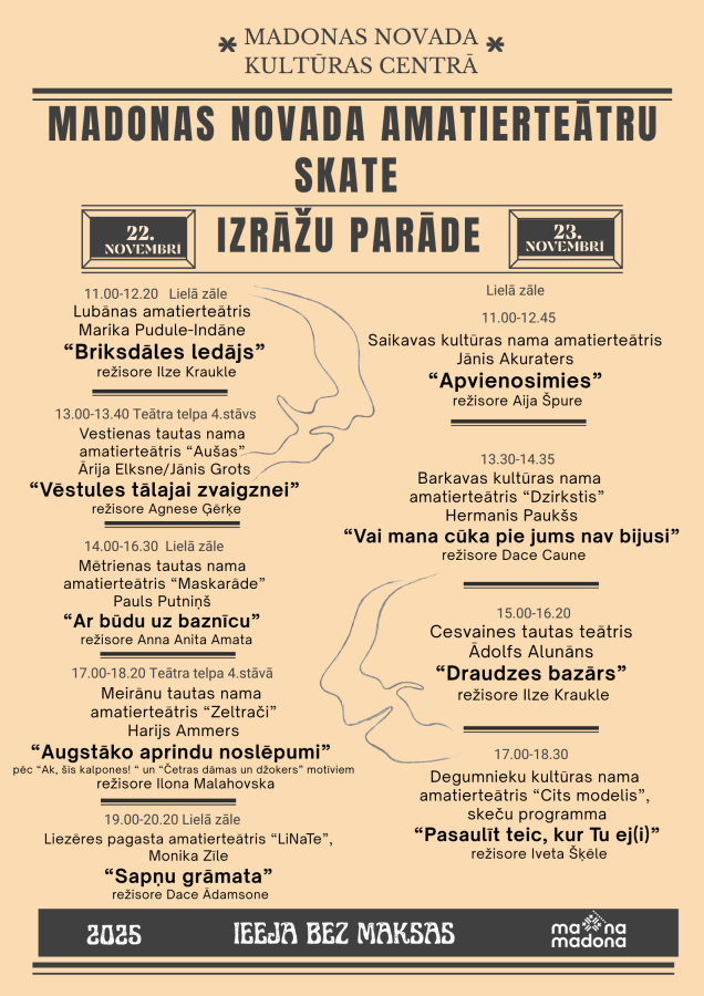 2025. gada 22. un 23. novembrī Madonas novada kultūras centrā deviņi no 21 Madonas novada amatierteātra piedalīsies Madonas novada amatierteātru skatē.