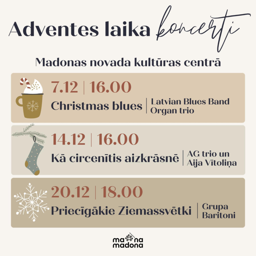 Ar pirmo Adventi ir sācies Ziemassvētku gaidīšanas laiks. Lai tas ikvienam ir gaišu pārdomu laiks, kā arī lai Madonas novada kultūras centra piedāvātie koncerti ir kā silts, muzikāls iepriecinājums un skaists kopābūšanas laiks ar saviem tuvākajiem šajā pirmssvētku laikā!