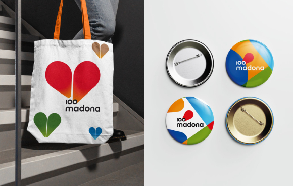 Simtgades svētku vizuālais tēls sakņojas Madonas novada jau esošajās grafiskajās vadlīnijās, nodrošinot pēctecību un atpazīstamību. Logotips sastāv no jau zināmā vārda "Madona" grafiskā risinājuma, kam pievienots īpaši pielāgots gadskaitlis "100". Kā salīdzinoši jaunai pilsētai, svētku vizuālās identitātes pamatā ir radošā ideja “Ar skatu nākotnē”, kur grafiskais elements kalpo kā tālskatis. Mainoties šī elementa formai, krāsai un novietojumam, tiek simbolizēts plašais redzesloks un mūsu novada daudzveidība, uzsverot Madonas pilsētu - kā otra lielākā un ģeogrāfiski visaugstāk Latvijā novietotā novada - centru.