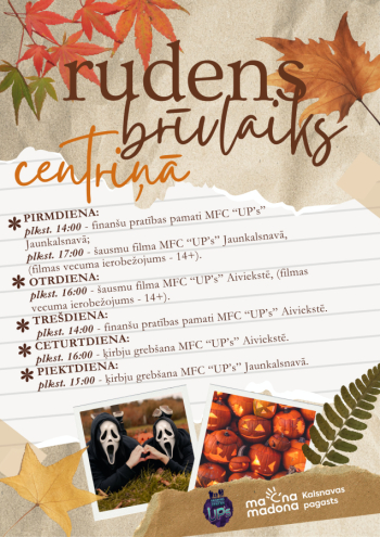 Aicinām visus skolēnus aktīvi un interesanti pavadīt rudens brīvlaiku kopā ar Multifunkcionālajā centrā “UP’s” Jaunkalsnavā un Aiviekstē! Katru dienu piedāvājam aizraujošas nodarbības un pasākumus, kas ļaus gan uzzināt ko jaunu, gan jautri pavadīt laiku ar draugiem