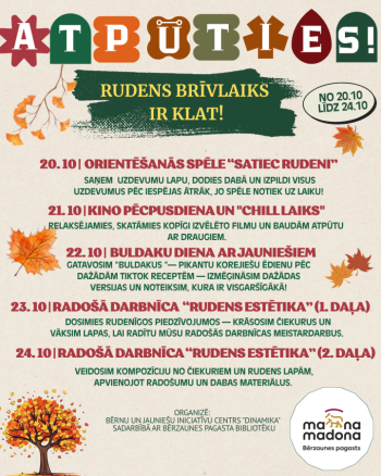 No 20. līdz 24. oktobrim aicinām bērnus un jauniešus pavadīt rudens brīvlaiku aktīvi, radoši un jautri!