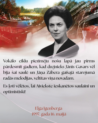 Neilgi pēc komponistes Elgas Igenbergas aiziešanas mūžībā, mūziķes nošu pierakstos un iecerēs atrasts 50 gadus sens dziesmu cikla uzmetums "Pie Aiviekstes". Ideja par dziesmu ciklu tapusi 1974.gadā Madonas novada Meirānos, tolaik jaunizveidotajā operas solista Jāņa Zābera memoriālajā muzejā "Vecais ceplis", kur komponiste vairākkārt viesojusies un satikusi arī muzeja vadītāju, dzejnieku Jāni Gavaru.
