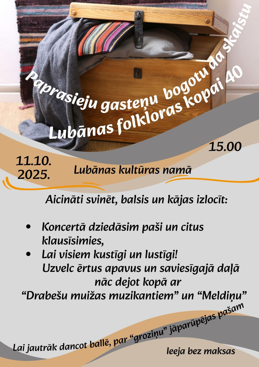 2025. gada 11. oktobrī plkst. 15.00 Lubānas kultūras namā aicinām uz Lubānas folkloras kopas 40 gadu darba jubilejas koncertu.