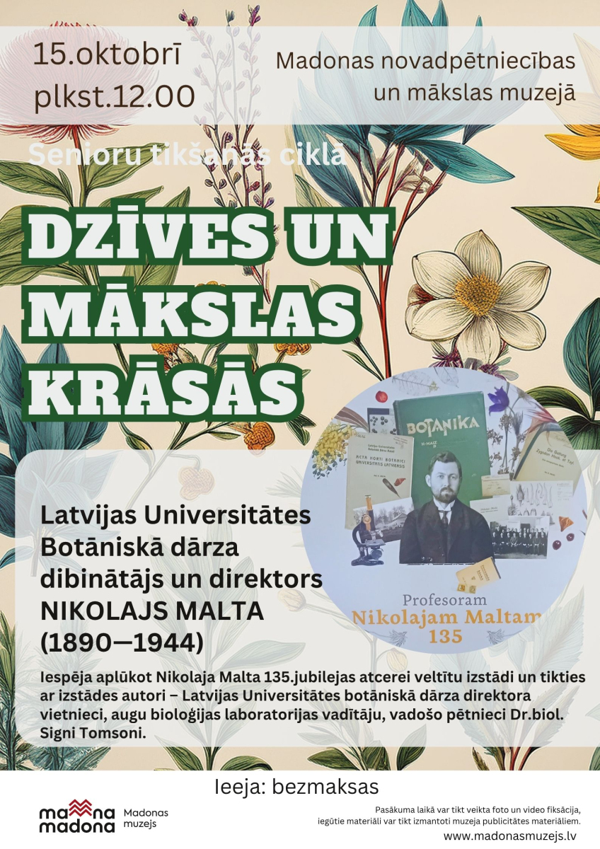 15. oktobrī plkst.12.00 aicinām pasākumu senioru tikšanās ciklā. Šajā tikšanās reizē iepazīsim botānikas profesora, Latvijas Universitātes Botāniskā dārza dibinātāju un pirmo direktoru Nikolaja Maltas (1890—1944). Iespēja aplūkot Nikolaja Malta 135.jubilejas atcerei veltītu izstādi un tikties ar izstādes autori – Latvijas Universitātes botāniskā dārza direktora vietnieci, augu bioloģijas laboratorijas vadītāju, vadošo pētnieci Dr.biol. Signi Tomsoni.