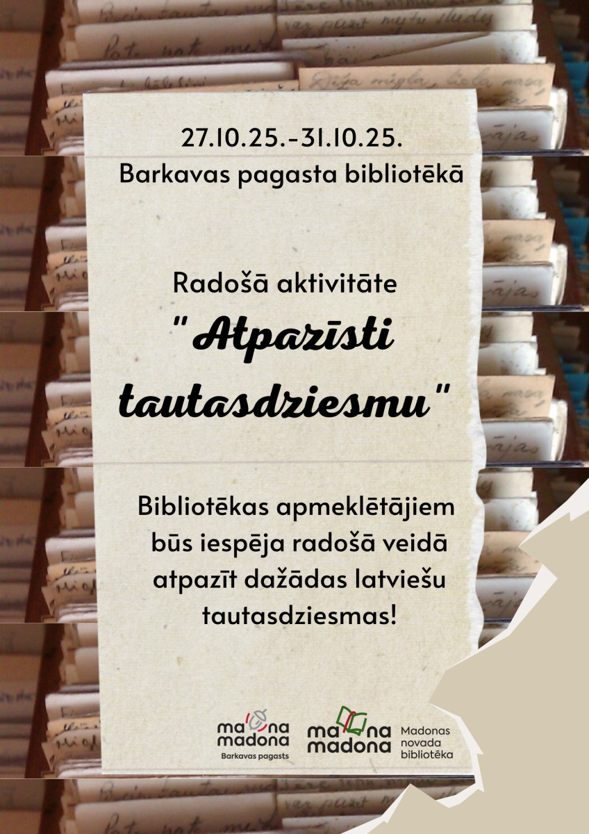 Barkavas bibliotēkas apmeklētājiem būs iespēja radošā veidā atpazīt dažādas latviešu tautasdziesmas.