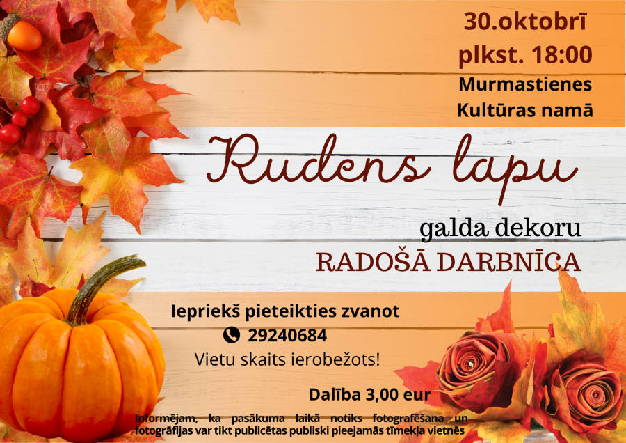 No rudenī pieejamiem materiāliem - koku lapām un ķirbjiem tiks veidotas kompozīcijas, kuras radošo darbnīcu apmeklētāji varēs izmantot savu mājas interjēru izdaiļošanai.
