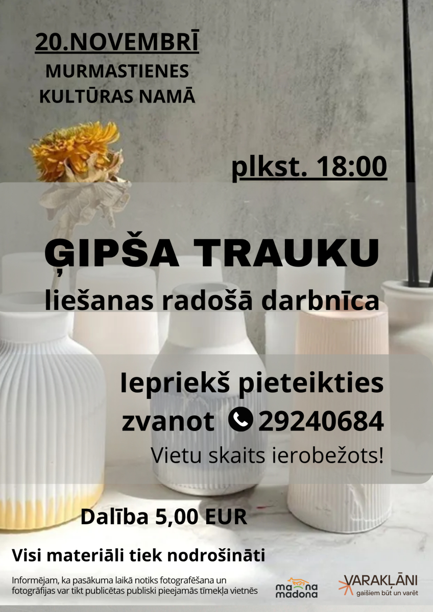 Darbnīcas laikā soli pa solim apgūsim, kā sagatavot formu, ieliet ģipsi, veidot faktūru un piešķirt krāsu vai apdari. Katrs dalībnieks dosies mājās ar paša rokām radītu skaistu interjera priekšmetu – trauku, kas var kļūt par lielisku dekoru vai dāvanu.