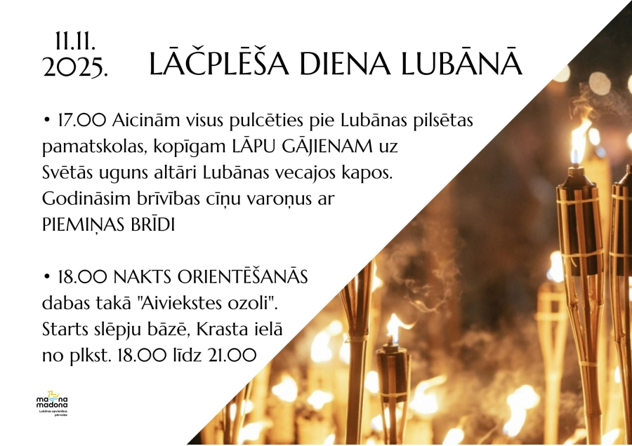 - 17.00 Aicinām visus pulcēties pie Lubānas vidusskolas, kopīgam lāpu gājienam no Lubānas vidusskolas uz Svētās uguns altāri Lubānas vecajos kapos. Godināsim brīvības cīņu varoņus ar piemiņas brīdi.