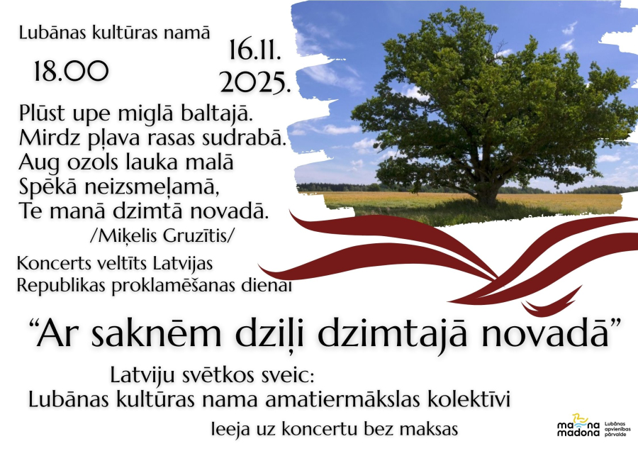 2026. gada 16. novembrī plkst. 18.00 Lubānas kultūras namā koncerts veltīts Latvijas republikas proklamēšanas dienai “Ar saknēm dziļi dzimtajā novadā”. Latviju svētkos sveic: Lubānas kultūras nama amatiermākslas kolektīvi.