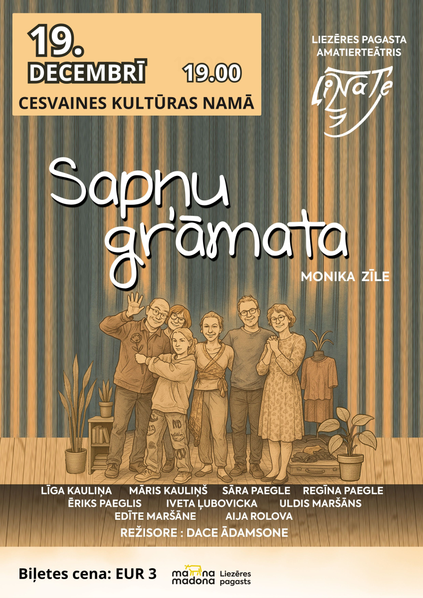 Liezēres pagasta amatierteātris „LiNaTe” skatītājus aicina uz Monikas Zīles lugas „Sapņu grāmata” iestudējumu – sirsnīgu un dzīvesgudru stāstu par trīs paaudžu attiecībām.