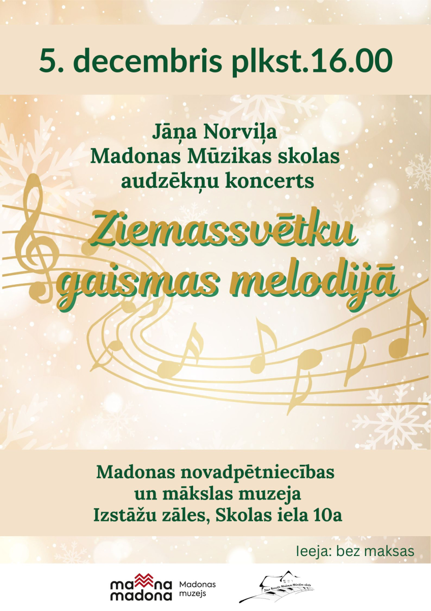 Madonas muzejs aicina uz Ziemassvētku ieskaņas pasākumu “Ziemassvētku gaismas melodijā”, kurā skanēs Jāņa Norviļa Madonas Mūzikas skolas audzēkņu sarūpēts koncerts.