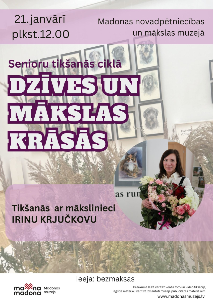 Aicinām Madonas novada seniorus uz ikmēneša tikšanos, šajā reizē - tikšanās ar mākslinieci Irinu Krjučkovu. Nupat kā atklāta mākslinieces darbu izstāde "Acis, kas runā" - tā atklāj mākslinieces neparasto spēju ieraudzīt dzīvnieku dvēseli un pārvērst to gleznās, kurās skatiens kļūst par galveno stāstnieku.