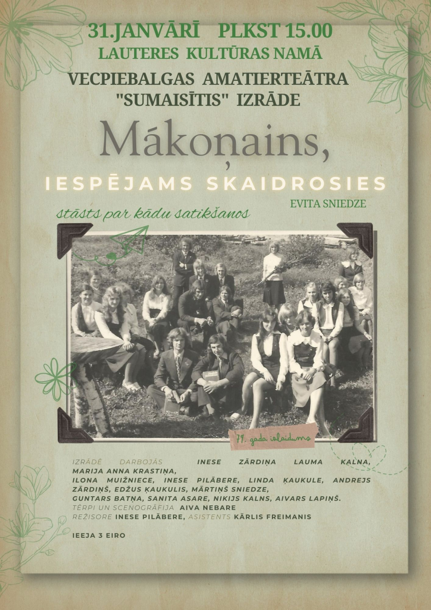 Vecpiebalgas amatierteātris “Sumaisītis” 31. janvārī plkst. 15.00 Lauteres kultūras namā rādīs savu iestudējumu Evitas Sniedzes lugai "Mākoņains, iesspējams skaidrosies".