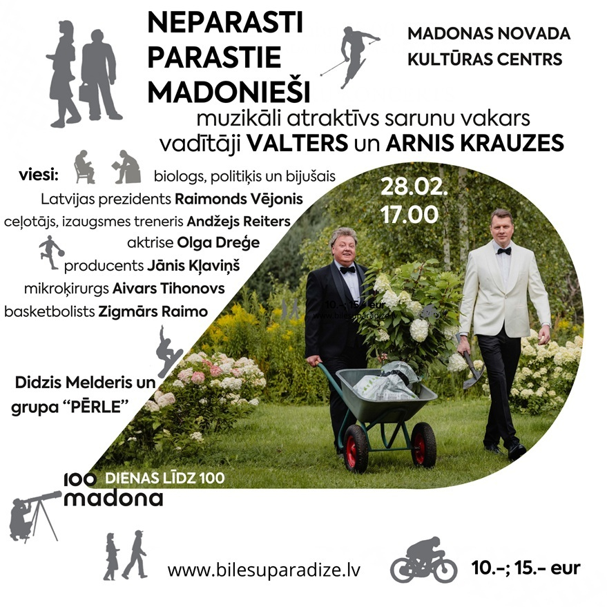 Šogad, Madonas pilsētas simtgades svētku gadā, akcentējot 100 dienas līdz Madonas simtgadei, 28.februārī plkst.17.00 Madonas novada kultūras centrā pasākums "Neparasti parastie madonieši" aicina satikt īpašos madoniešus, kurus atpazīstam ne tikai Madonā, bet visā Latvijā un ārpus Latvijas robežām.