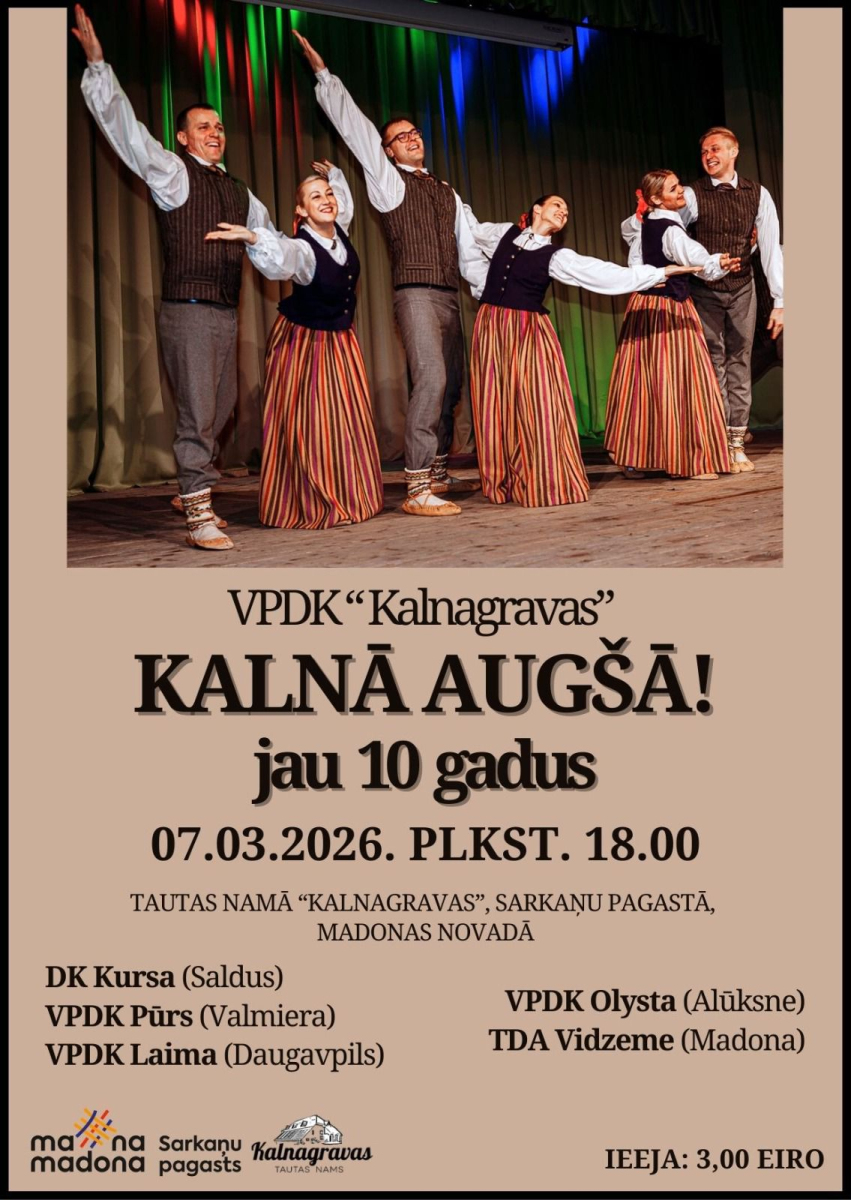 VPDK “Kalnagravas” savu 10. sezonas sadanci atzīmēs kopā ar draugiem no Kurzems, Vidzemes un Latgales, lai kopā izdejotu skaistu koncertu un vēlreiz uzsauktu “Kalnā augšā!”.