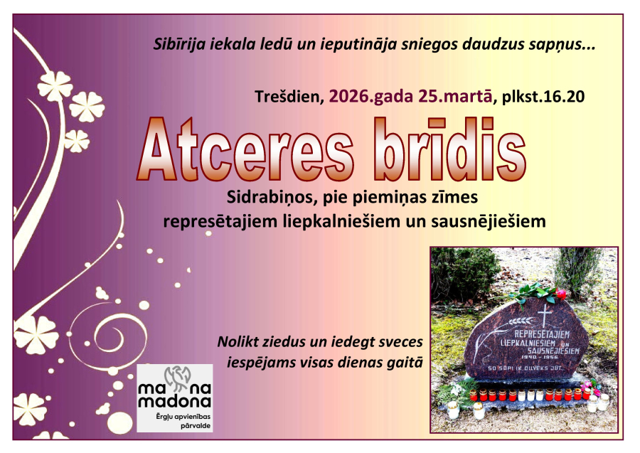 Plkst. 16.20 esiet aicināti uz svinīgu atceres brīdi Sidrabiņos pie piemiņas zīmes represētajiem liepkalniešiem un sausnējiešiem. Svecīšu aizdegšana un ziedu nolikšana iespējama visas dienas garumā.