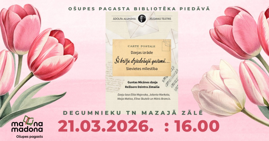 Ošupes pagasta bibliotēka sadarbībā ar Degumnieku TN aicina uz Ādolfa Alunāna Jelgavas teātra dzejas izrādi “Šī brīža dziedošajā gaismā… Sievietes mīlestība”, kuru pēc Guntas Micānes dzejas veidojusi režisore Dzintra Zimaiša.