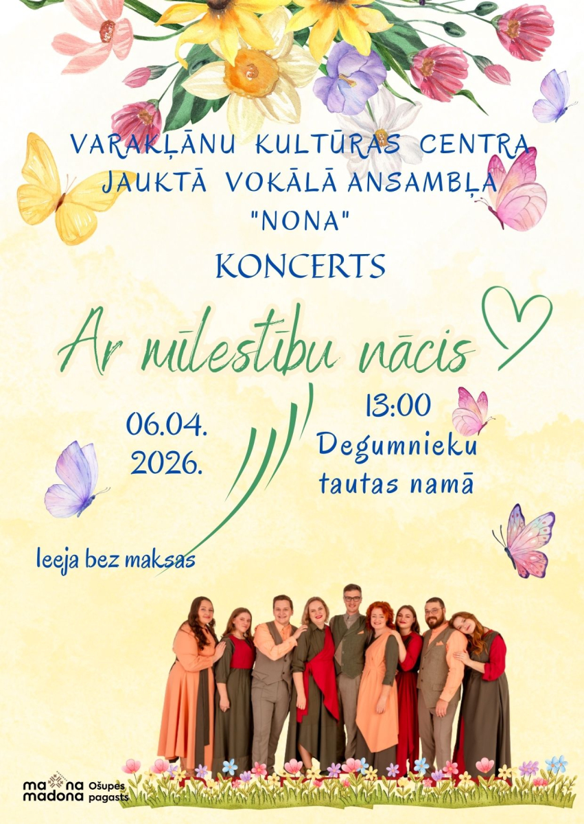 Lieldienu laikā, kad daba mostas un sirdis piepildās ar gaismu, Varakļānu kultūras centra jauktais vokālais ansamblis “Nona” aicina uz sirsnīgu koncertu “Ar mīlestību nācis”.