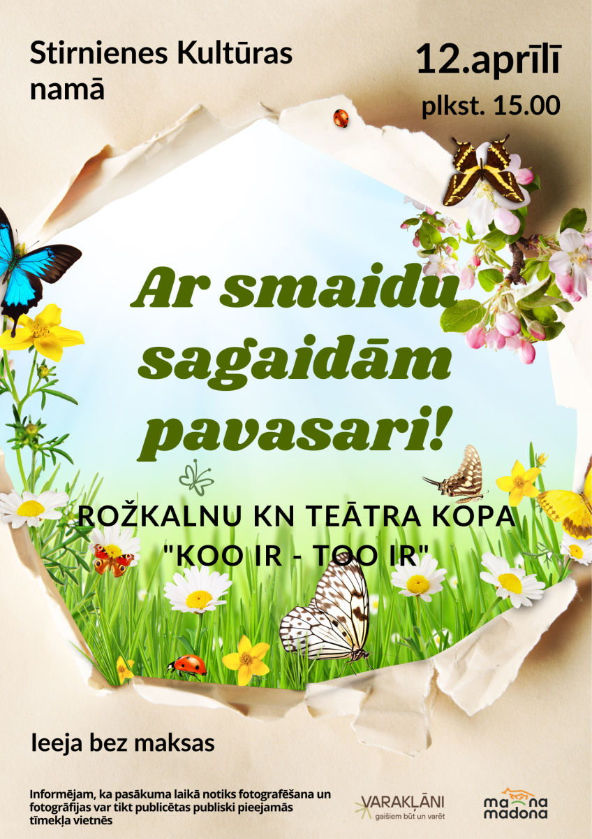 Kad gan vēl, ja ne pavasarī, mums vajag visvairāk smaidu un laba garastāvokļa? Tāpēc 12. aprīlī plkst. 15.00 Stirnienes Kultūras namā viesosies un jautrību garantēs Rožkalnu KN teātra kopa "KOO IR - TOO IR" ar pasākumu "Ar smaidu sagaidām pavasari!".