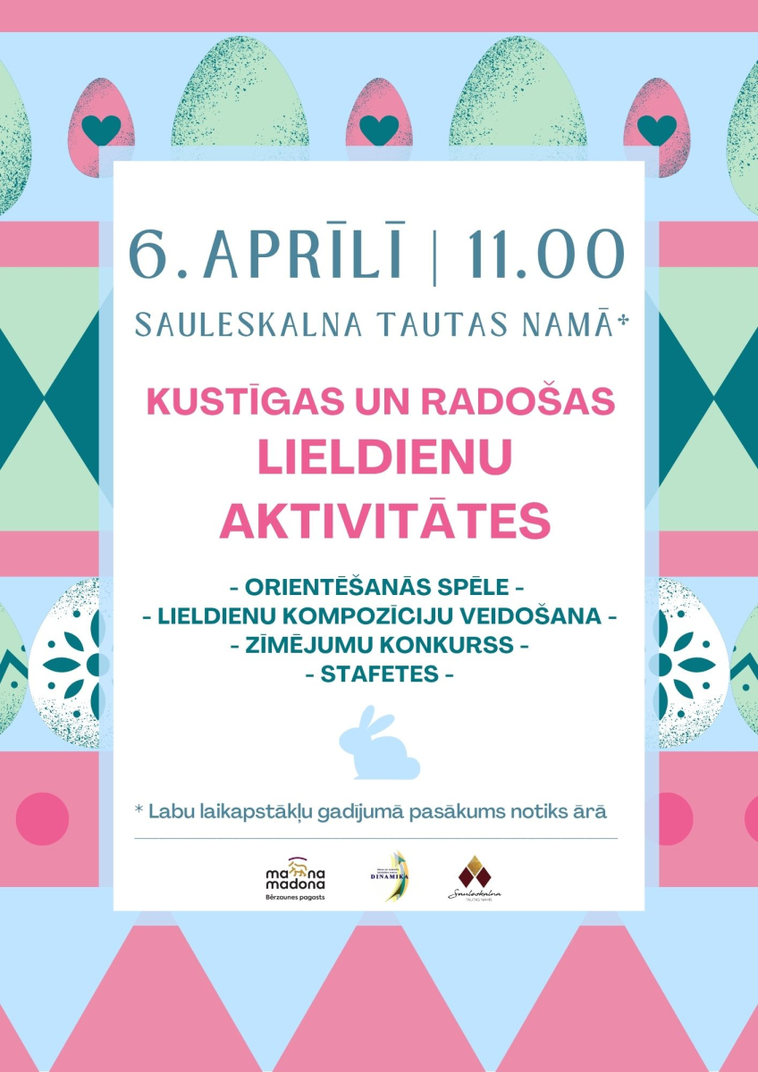 Pasākuma programmā kustīgas un radošas aktivitātes: orientēšanās spēle, Lieldienu kompozīciju veidošana, zīmējumu konkurss, stafete un citas.