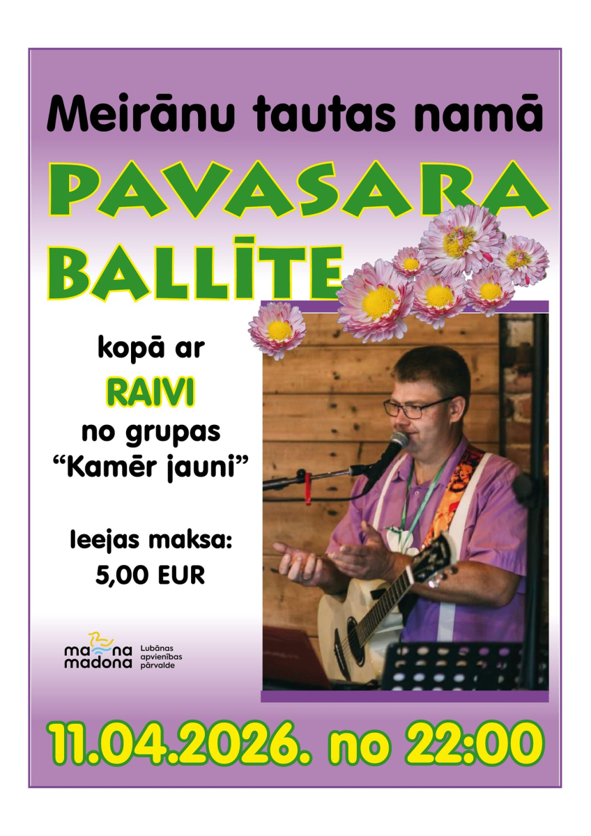 11. aprīlī no plkst. 22.00 Meirānu tautas namā pavasara ballīte kopā ar Raivi no grupas "Kamēr jauni".