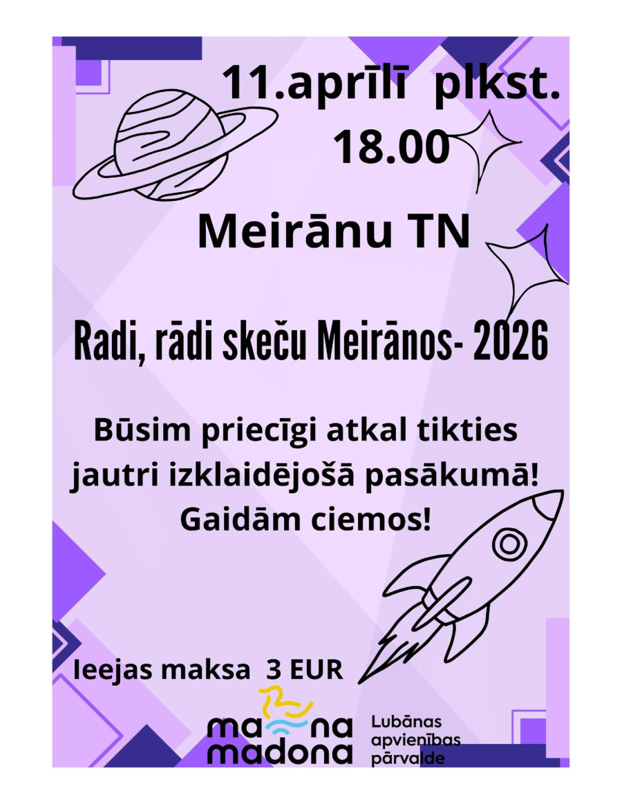 Meirānu tautas nama amatierteātis "Zeltrači", kā ik gadu, aicina uz jautri izklaidējošu skeču pasākumu "Radi, rādi skeču Meirānos 2026".