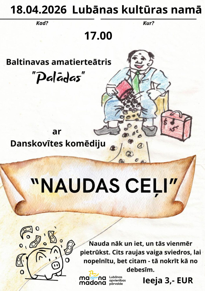 18. aprīlī plkst. 17.00 Lubānas kultūras namā Baltinavas amatierteātris “Palādas” ar Danskovītes komēdiju “Naudas ceļi”.