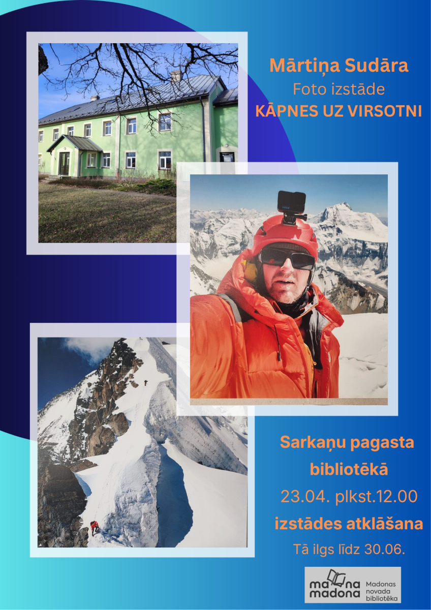 Bibliotēku nedēļas ietvaros 23.aprīlī plkst. 12.00 Sarkaņu pagasta bibliotēka aicina uz Mārtiņa Sudāra foto izstādes “Kāpiens uz virsotni” atklāšanu.