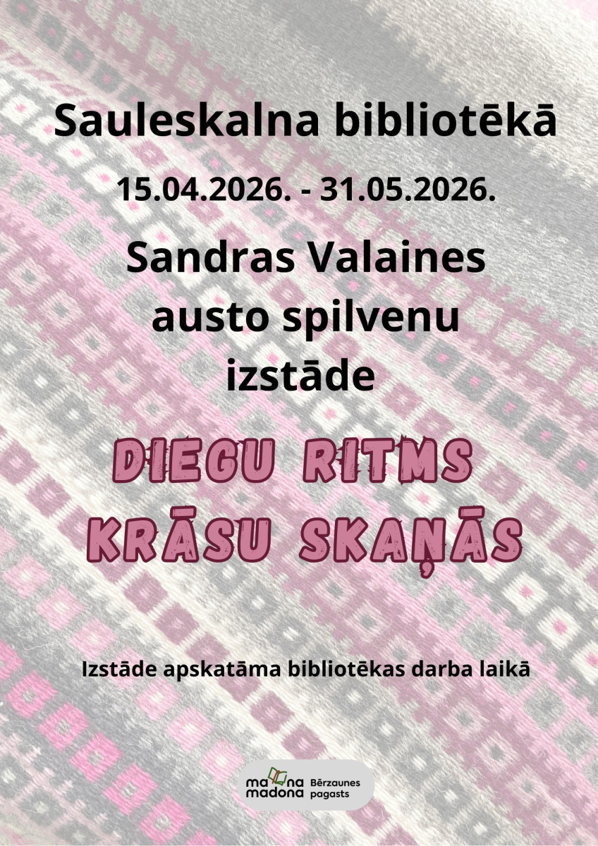 Sauleskalna bibliotēkā skatāma mākslinieces Sandras Valaines austo spilvenu un virtuves cimdiņu izstāde. Izstādē apskatāmie darinājumi ir austi Skandināvijā iecienītajā "krahbrahts" tehnikā. Krāsaini un daudzveidīgi – tādi ir šie darbi. Un, ja katrai krāsai būtu atbilstoša skaņa, tad kopā šie darbi veidotu simfoniju.