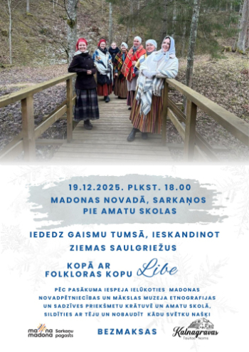 19. decembris 18:00 - 19:00; Amatu skola, Sarkaņi; SarkaņiAicinām ieskandināt Ziemassvētkus un iepazīt latviskās tradīcijas kopā ar folkloras kopu “Libe”.