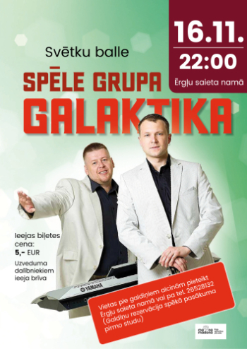 16. novembris 22:00 - 17. novembris 02:00; Ērgļu saieta nams; ĒrgļiUz svētku balli aicina populārā grupa “Galaktika”, kuras sastāvu veido divi talantīgi mūziķi – Normunds Zušs un Vitolds Gorņevs.