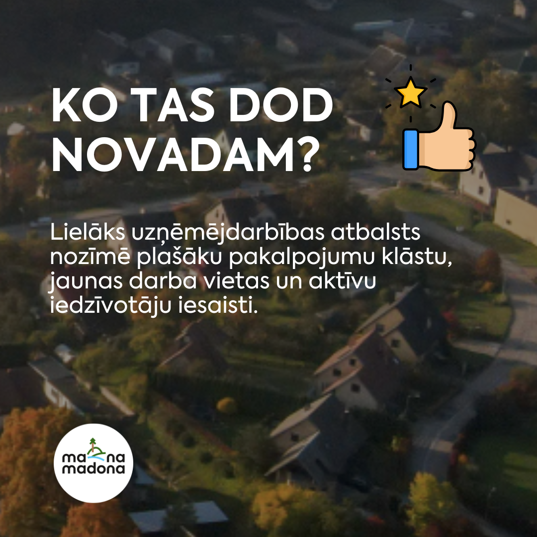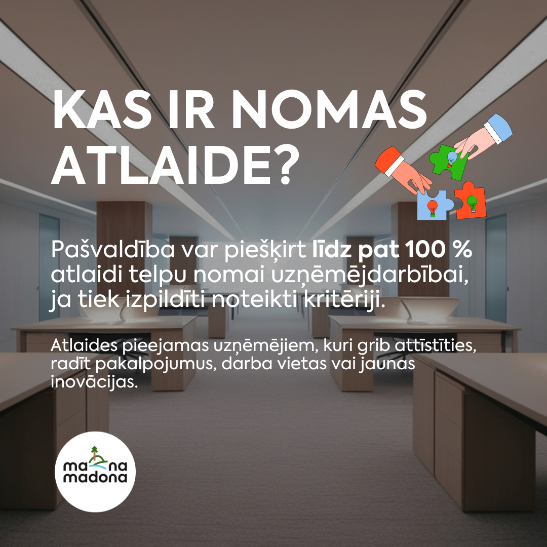 Madonas novada pašvaldība aicina vietējos uzņēmējus izmantot iespēju samazināt telpu nomas izmaksas un novirzīt investīcijas uzņēmuma attīstībai, jaunu darba vietu izveidei vai  sabiedrībai nozīmīgu projektu īstenošanai.