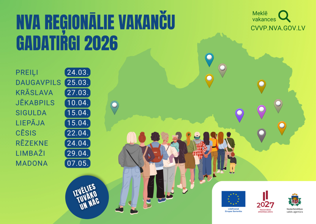 2026. gada martā, aprīlī un maijā Nodarbinātības valsts aģentūra (NVA) rīkos reģionālos vakanču gadatirgus Preiļos, Daugavpilī, Krāslavā, Jēkabpilī, Liepājā, Siguldā, Cēsīs, Rēzeknē, Limbažos un Madonā, lai reģionu darba devēji un darba meklētāji varētu satikties vienuviet un klātienē pārrunāt ar darba attiecību uzsākšanu saistītus jautājumus.