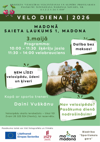 Projekta “Veselības veicināšanas un slimību profilakses pasākumu īstenošana Madonas novadā” ietvaros (projekta Nr. 4.1.2.2/1/24/I/018) 2026. gada 3.maijā Saieta laukums 1, Madona, notiks Velo diena kopā ar sporta treneri Daini Vuškānu.iesūtīts: 21.04.2026lasīt tālāk