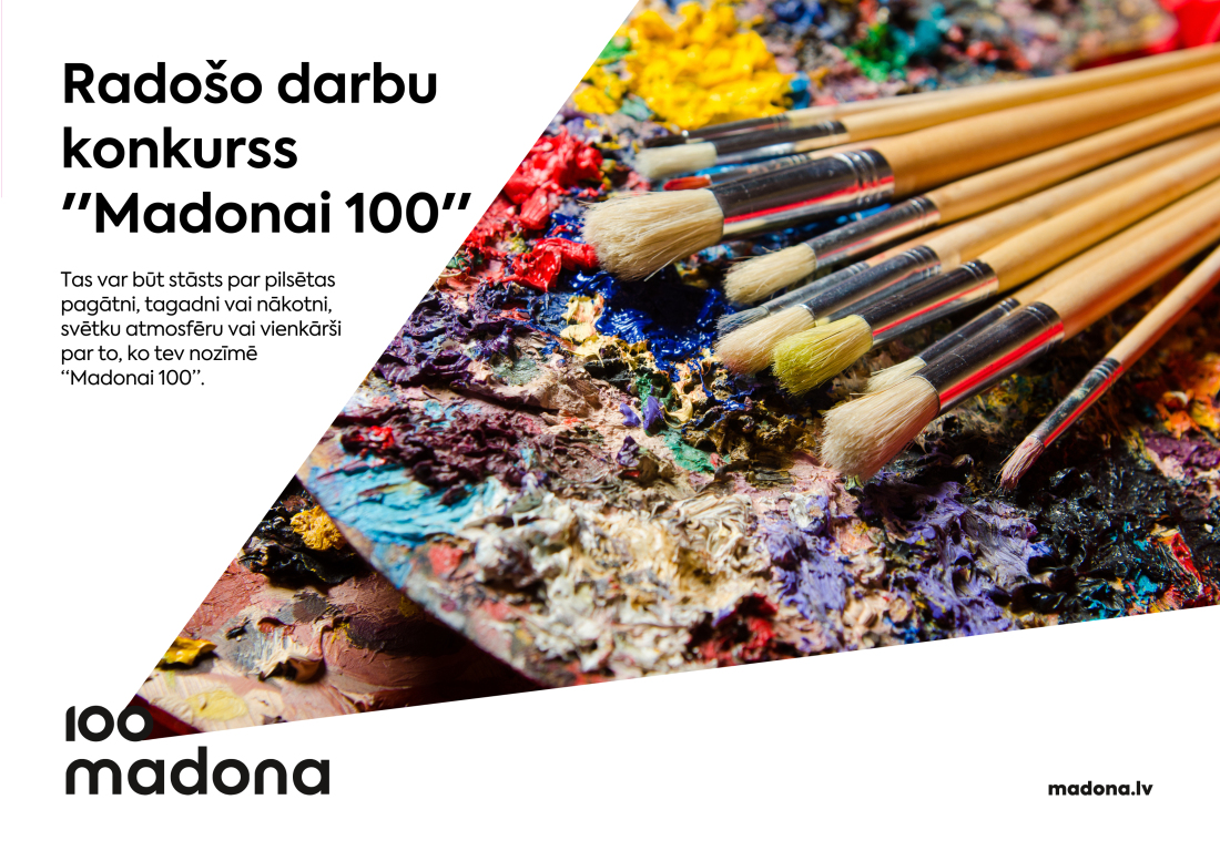 Iemūžini savā darbā Madonas pilsētas simtgades svētku sajūtu, vēsturi, cilvēkus, vietas un notikumus, kas tev šķiet īpaši. Tas var būt stāsts par pilsētas pagātni, tagadni vai nākotni, svētku atmosfēru vai vienkārši par to, ko tev nozīmē “Madonai 100”.