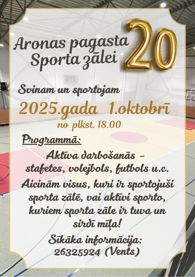 Aronas pagasta sporta zāle svin jubileju un aicina sportot2025.gada 1.oktobrī plkst.18:00, aicina visus, kas sportojuši sporta zālē, vai turpina sportot , visus kam patīk aktīvs un veselīgs dzīvesveids, nosvinēt sporta zāles 20.gadu jubileju aktīvā un sportiskā gaisotnē.